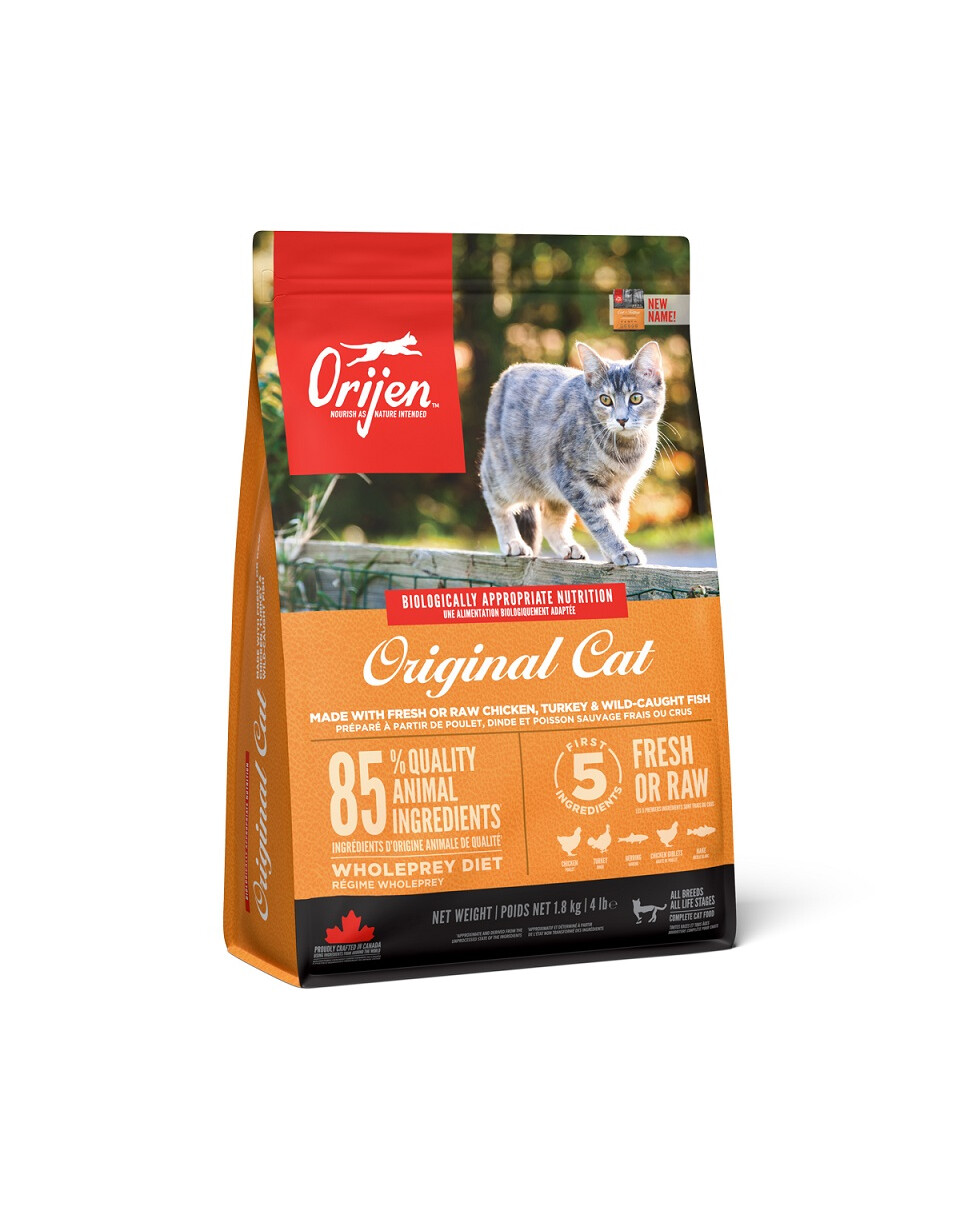 Inovativní receptura vytvořená specialisty společnosti Orijen je založena na živočišných produktech bohatých na bílkoviny. Orijen Cat je krmivo složené z 85 % z masa. Patří mezi ně čerstvé a celé maso z kuřat, krůt - jejich játra a celé a čerstvé ryby, jako jsou platýs a sleď. Doplňují se krůtími a kuřecími srdíčky. Zbývajících 15 % složení tvoří ovoce a zelenina vybrané tak, aby se dosáhlo co nejvyšší dávky vitaminů a doplňkových látek - mrkev, červená jablka, červená řepa, brusinky, dýně ve dvou odrůdách, hrušky a borůvky. Specifickou vůni dodává přítomnost levandule a šípků. Krmivo má univerzální charakter, tj. je vhodné pro kočky, které tráví většinu času uvnitř, i pro ty, které vedou aktivní životní styl. Orijen neobsahuje žádné obiloviny, což je ještě účinnější při zvyšování hladiny energie v každodenním životě.