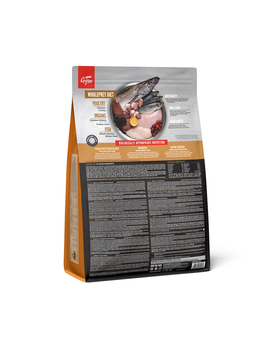 čerstvé kuřecí maso (20 %), syrové krůtí maso (10 %), syrový celý sleď (9 %), čerstvé kuřecí orgány (játra, srdce) (6 %), syrový celý severopacifický štikozubec (5 %), syrová krůtí játra (5 %), čerstvá vejce (5 %), sušené kuřecí maso (4 %), dehydratované krůtí maso (4 %), dehydratovaná makrela (4 %), dehydratovaná sardinka (4 %), dehydratovaný sleď (4 %), kuřecí tuk (4 %), celá červená čočka, celý hrách, celá zelená čočka, celá cizrna, čočková vláknina, celé fazole pinto, hrachový škrob, celé bílé fazole, olej z tresky tmavé (1 %), sušené mořské řasy, čerstvá celá dýně, čerstvá celá mušketa, čerstvá celá cuketa, čerstvá celá mrkev, čerstvá celá jablka, čerstvé celé hrušky, sušený kořen čekanky, čerstvá kapusta, čerstvý špenát, čerstvé listy červené řepy, čerstvé listy tuřínu, celé brusinky, celé borůvky, celé bobule saskatoon, kurkuma, ostropestřec mariánský, kořen lopuchu, levandule, kořen kozlíku lékařského, šípky. PŘÍSADY (na kg): technologické přísady: tokoferolový extrakt z rostlinných olejů: 121 mg, kyselina citronová: 40 mg. Senzorické přísady: rozmarýnový extrakt: 80 mg. Výživové přísady: 3a890 cholinchlorid (cholin): 1190 mg, 3b606 (zinek): 105 mg, 3b406 (měď): 11 mg, 3a821 vitamin B1: 12,5 mg, 3a825i vitamin B2: 10 mg, 3a314 vitamin B3: 50 mg, 3a841 vitamin B5: 8 mg, 3a831 vitamin B6: 6,5 mg, 3a316 vitamin B9: 0,75 mg, 3a880 vitamin B7: 0,13 mg, vitamin B12: 0,1 mg, 3a710 vitamin K3: 0,5 mg, 3a672a vitamin A: 3750 IU, 3a671 vitamin D3: 500 IU, 3a700 vitamin E: 290 IU, 3a300 vitamin C: 12,5 IU. Zootechnické přísady: 4b1707 Enterococcus faecium NCIMB 10415 2,2x10^6 CFU.