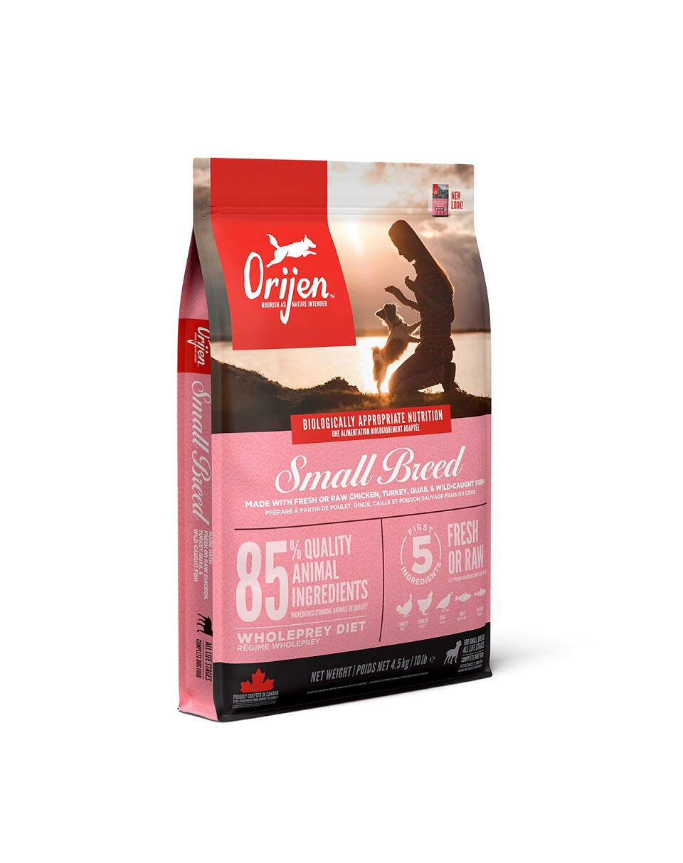 Orijen Small Breed je bohatý na krůtu, kuře, křepelky, vejce a ryby. Krmivo bylo vyvinuto speciálně pro menší psy. Malé granulky jsou pro malé psy snazší k jídlu. Masové složky v receptuře Small Breed pocházejí z malých druhů zvířat a odrážejí tak evoluční stravu psů malých plemen.