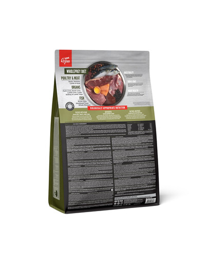 Složení: čerstvá koza (5%), čerstvý divočák (5%), čerstvá zvěřina (5%), čerstvý alpský pstruh (5%), čerstvá kachna (5%), čerstvé jehněčí (4%), čerstvý pstruh (4 %)), čerstvá kachní játra (4%), čerstvá játra divočáka (4%), čerstvé ledviny divočáka (4%), sušená makrela (4%), sušená celá pacifická sardinka (4%), sušené jehněčí (4 %), sušené skopové (4%), sušené tresky aljašské (4%), sušené modré bílé (4%), kachní tuk (4%), sušené sledě (4%), červená čočka, zelená čočka, zelený hrášek, cizrna , žlutý hrášek, fazole pinto, čočková vláknina, čerstvé ovčí žaludky (1,5%), tuk ze sleďů (1%), čerstvé kozí srdce (1%), čerstvé kozí ledviny (1%), čerstvé kozí játra (0,5%), čerstvé herní srdce (0,5%), čerstvá játra ze zvěřiny (0,5%), čerstvá ovčí játra (0,5%), čerstvá divoká srdce (0,5%), fazole haricot, lyofilizovaná kozí játra, lyofilizovaná játra ze zvěřiny, čerstvá dýně, čerstvá ořešáková tykev, čerstvá cuketa, pastinák, mrkev, červená jablka, hrušky, kel, špenát, mangold, listy tuřínu, řasy, brusinky, borůvky, kořen čekanky, kořen kurkumy, ostropestřec mariánský, kořen lopuchu, květy levandule, kořen marshmallow, šípek, Enterococcus faecium.