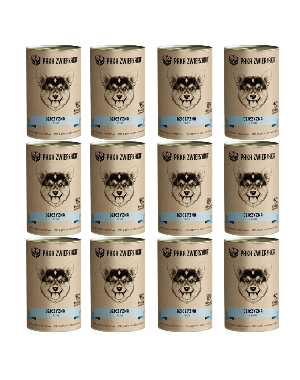 Konzervy jsou kompletní a vyvážené jídlo pro psy všech věkových kategorií. Obsahuje až 98% zvěřiny s vývarem a lososem! Vyrobeno z vysoce kvalitního čerstvého, šťavnatého masa a drobů. Je bohaté na živiny a vysoce stravitelné zdroje živočišných bílkovin.
