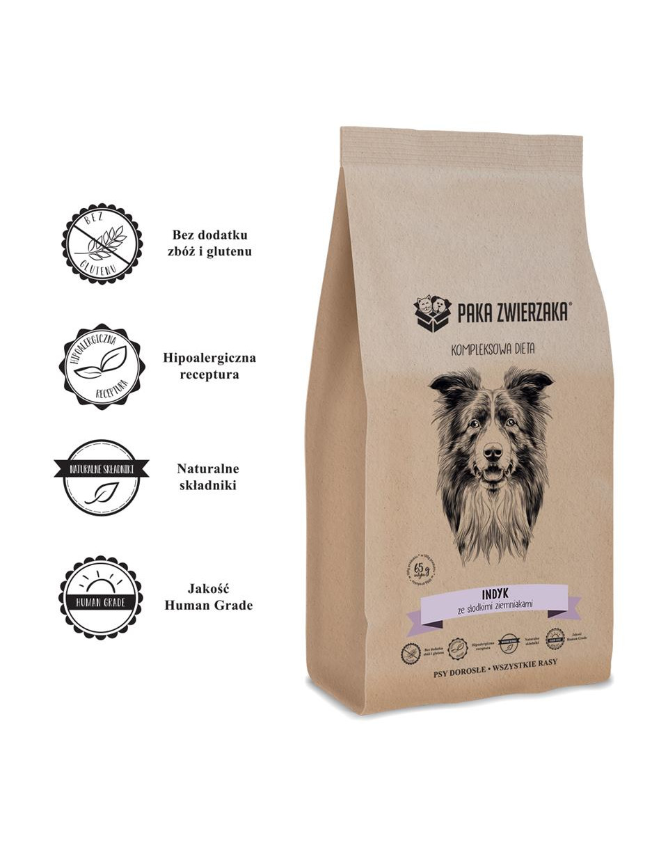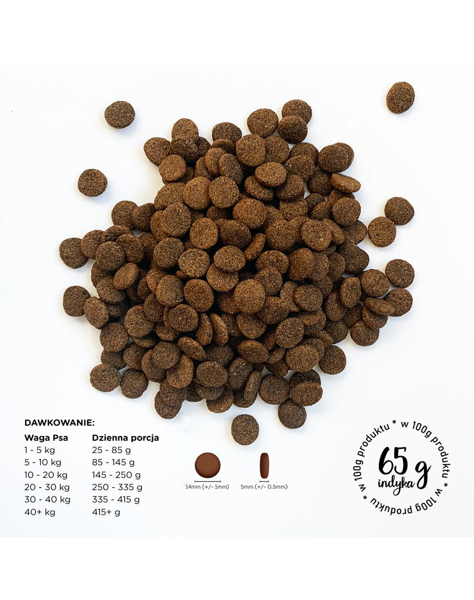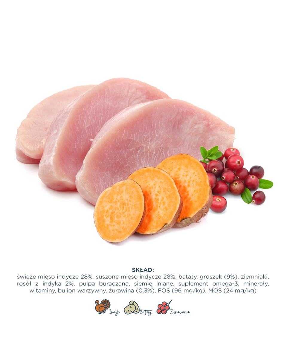 Přírodní, bezlepkové suché krmivo s velmi vysokým obsahem čerstvých surovin. Obsahuje až 65 g krůtího ve 100 g produktu! Vyrobeno z vysoce kvalitního čerstvého, šťavnatého masa. Je bohaté na živiny a vysoce stravitelné zdroje živočišných bílkovin. Díky použití jednoho typu bílkovin je vhodnou potravou pro snížení rizika alergie a potravinové intolerance.