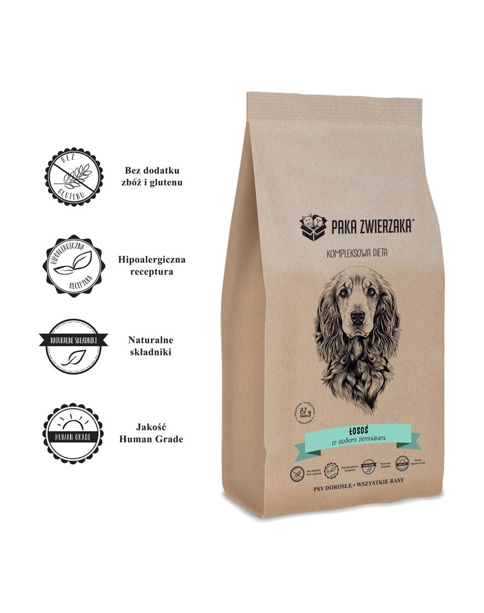 Losos 65% (z toho čerstvě připravený losos 35%, sušený losos 23%, olej z lososa 4%, vývar z lososa 3%), sladké brambory, hrách, dužina červené řepy, kopr 4%, špenát 4%, fenykl 4%, chřest 4%, rajčata 4%, doplněk stravy omega-3, minerály, vitamíny, FOS (96 mg/kg), MOS (24 mg/kg), extrakt z oleje 0,01%.