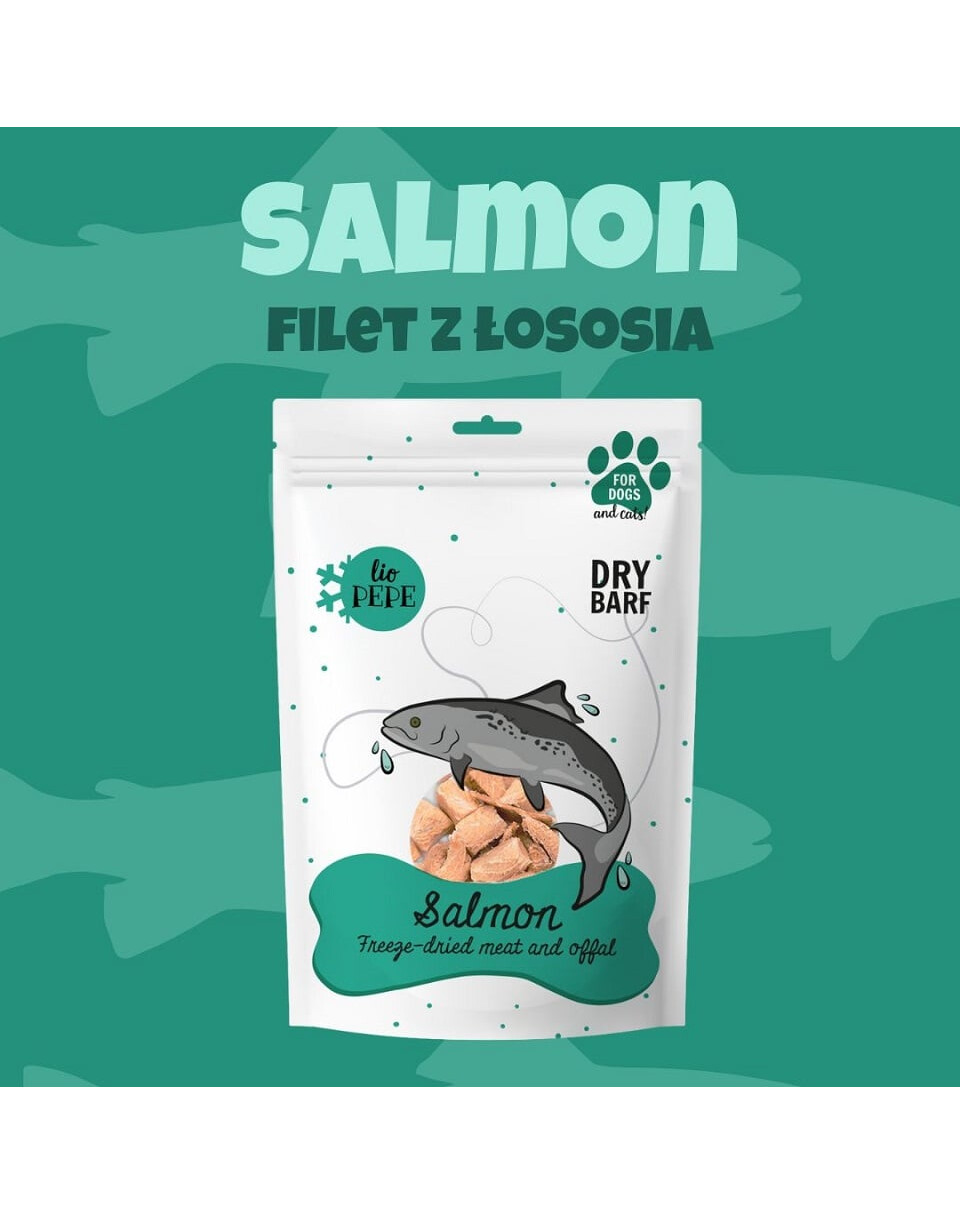 PEPE ANIMAL PACK Lyofilizované maso z lososových filetů je dokonalým doplňkem stravy vašeho psa.