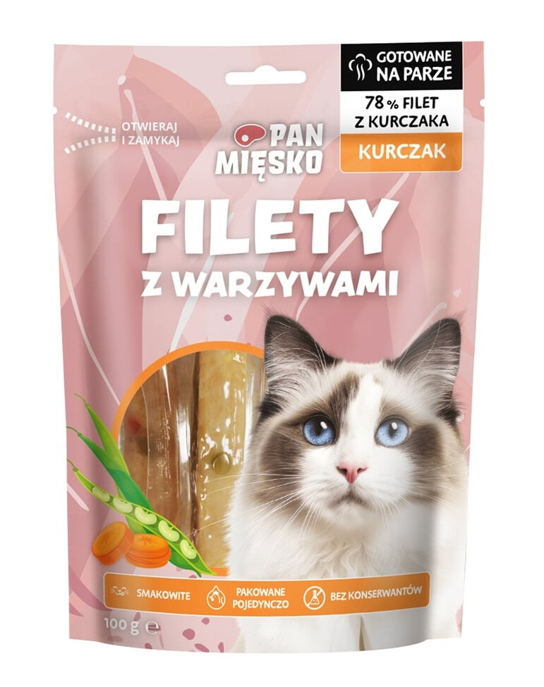 Je vaše kočka fanouškem drůbeže? Můžete si být jisti, že si filety Mr. MIESKO zamiluje! Jemné, aromatické kuřecí filety s chutnou zeleninou jsou perfektní měkkou svačinkou, kterou můžete své kočce dát jako odměnu. Měkký filet na konci hry pomůže uspokojit přirozený lovecký instinkt vaší kočky.