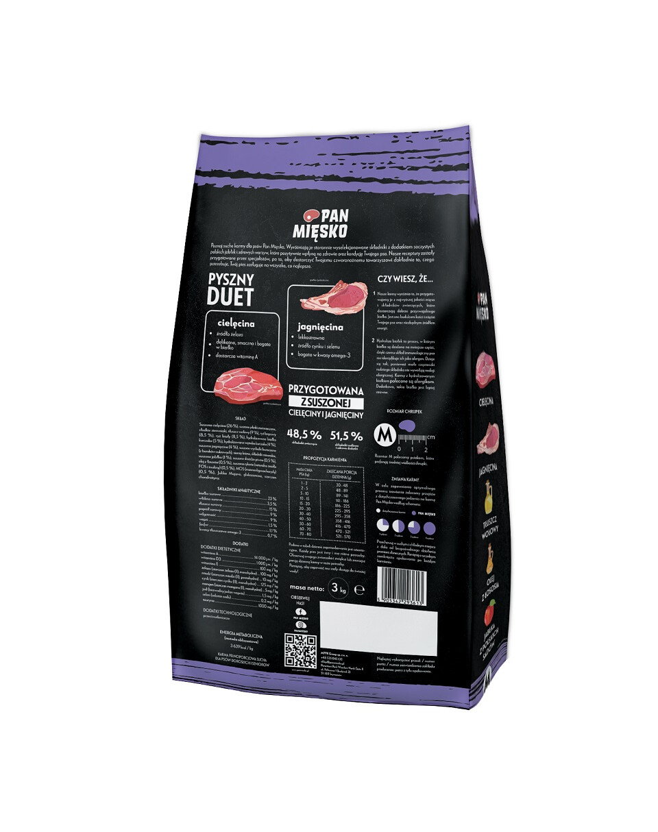 Receptura Mr Meat Calf with Lamb je připravena na základě speciálních potřeb starších psů a seniorů. Obsahuje množství výživných bílkovin přiměřené věku. Snížené množství tuku má pozitivní vliv na fungování jater a slinivky břišní dospělého organismu. Přídavek omega - 3 kyselin, glukosaminu a chondroitin sulfátu pomáhá podporovat zdravé klouby a přídavek taurinu pomáhá podporovat srdce. V této receptuře jsme nahradili výživný hrách lehce stravitelnými batáty a bramborami, takže s podporou extraktu z juky mojavské a přídavkem prebiotik MOS a FOS je krmivo lehce stravitelné a má pozitivní vliv na trávicí a zažívací systém.