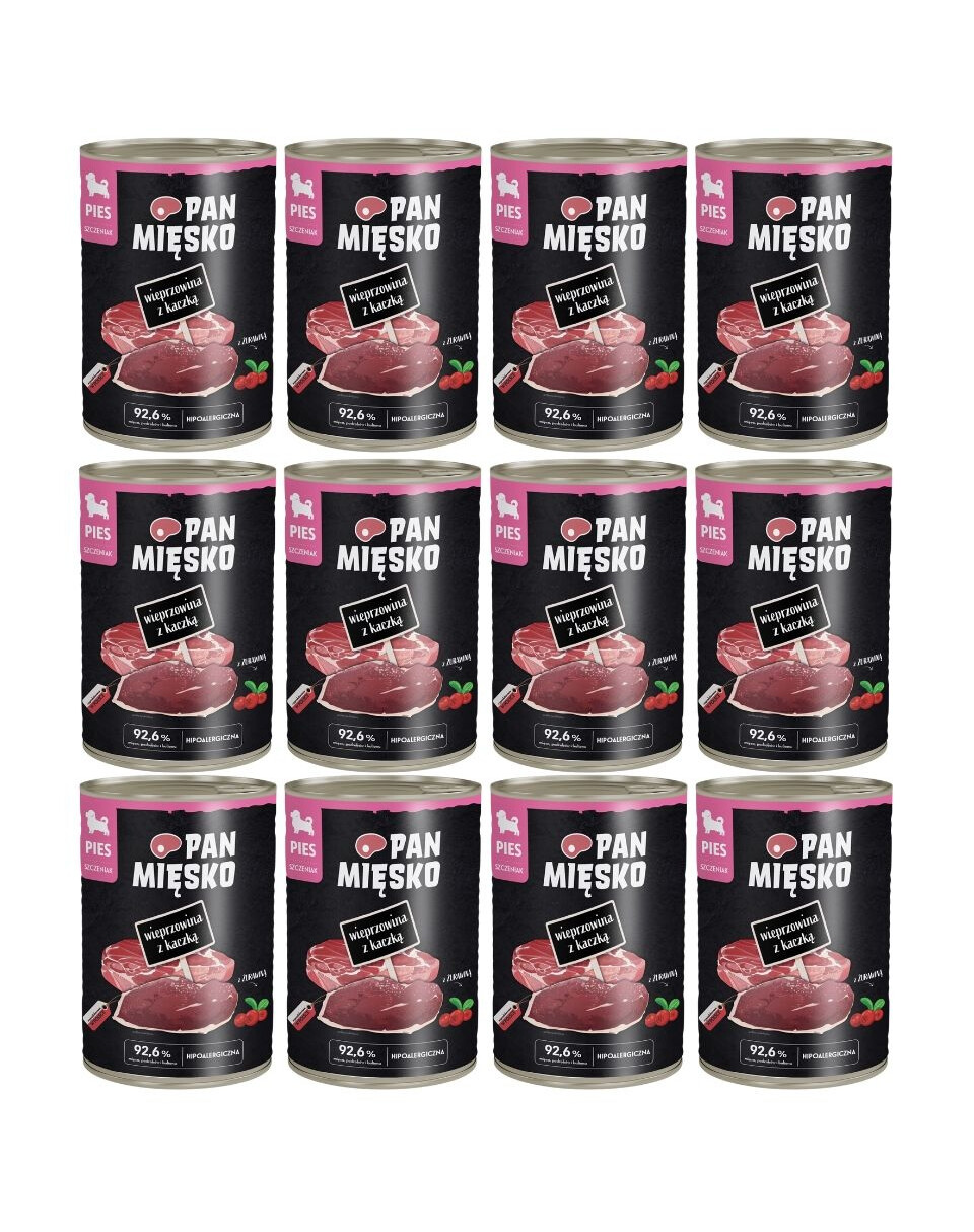 SLOŽENÍ: 50 % vepřové maso (28 % maso, 11 % plíce, 6 % játra, 5 % ledviny), 27,6 % vývar, 15 % maso z kachny, 6 % jablka, 1 % minerály, 0,2 % lososový olej, 0,1 % sušené pivovarské kvasnice, 0,1 % brusinky.