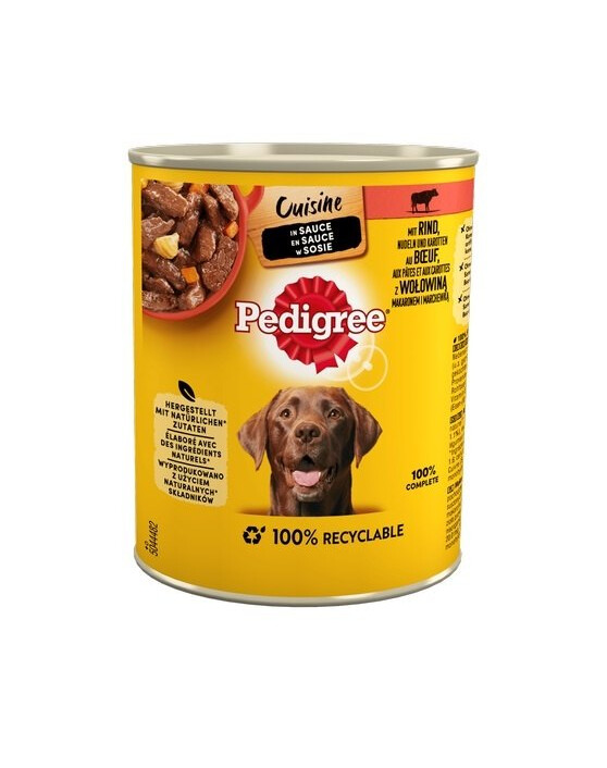 PEDIGREE Cuisine s hovězím masem, těstovinami a mrkví v omáčce je krmivo, které odpovídá potřebám dospělých psů. V této chuťové kompozici váš mazlíček objeví jemné kousky masa s lahodnými těstovinami a mrkví v aromatické omáčce s provensálskými bylinkami. Tato kompletní krmiva jsou zdrojem vitaminů D3 a E a zinku, který podporuje zdraví kůže a krásnou srst vašeho psa. PEDIGREE Adult Cuisine s hovězím masem, těstovinami a mrkví v omáčce obsahuje přírodní vlákninu pro optimální trávení. Krmením vašeho psa krmivem PEDIGREE si zajistíte udržení zdravé energie a pohody. Jeho složení bylo vyvinuto odborníky na výživu a veterináři ve WALTHAMTM Institute of Animal Science. Obal je 100% recyklovatelný.