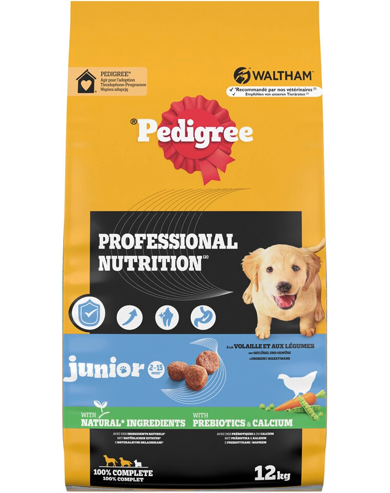Suché krmivo pro štěňata PEDIGREE COMPLETE je 100% plnohodnotné a vyvážené jídlo připravené z přírodních ingrediencí, s přídavkem vitamínů, minerálů a prebiotik – vše, co každé štěně potřebuje, aby mělo energii pro radostný a plný život. Bez přídavku umělých barviv a chuťových přísad.