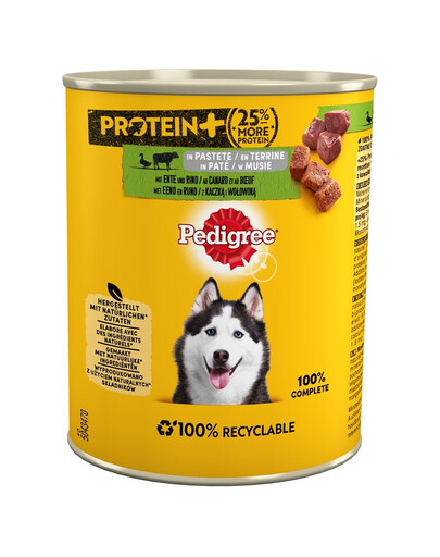 Proteinová konzerva pro psy s hovězím a kachním masem.
