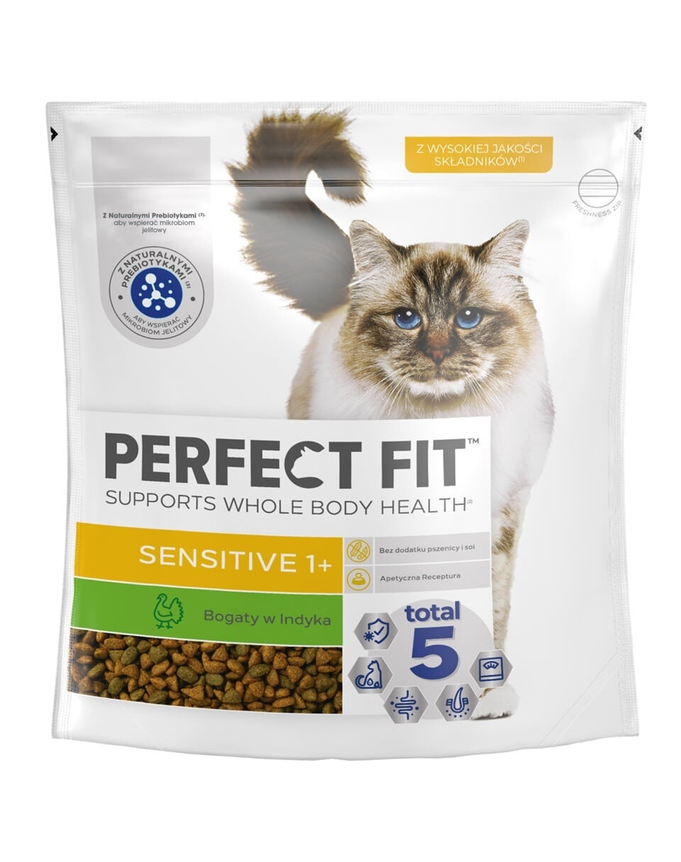 Krmivo Perfect Fit Sensitive 1+ obsahuje jedinečnou formuli Total 5, která podporuje 5 nejdůležitějších oblastí zdraví dospělého mazlíčka: podporuje silný imunitní systém, zdravé trávení, zdravý močový systém, zdravou kůži a srst a udržení optimální kondice a tělesné hmotnosti. Receptura Perfect Fit Sensitive 1+ byla vyvinuta ve spolupráci s veterináři a specialisty na výživu z Institutu vědy o zvířatech WALTHAM, aby poskytla nezbytné živiny dospělým, citlivým kočkám. Stejně jako ostatní varianty, také krmivo Perfect Fit Sensitive 1+ bohaté na krůtu poskytuje další výhody: je vyrobeno bez pšenice a sóji, má chutnou recepturu a také obsahuje přírodní prebiotika, aby se staralo o střevní mikrobiom. Výběrem tohoto krmiva pro svého citlivého mazlíčka máte jistotu, že jedinečná formule Perfect Fit podporuje zdraví celého těla vaší kočky a poskytuje jí další zdravotní výhody, které jsou speciálně přizpůsobeny jejímu věku a individuálním požadavkům.