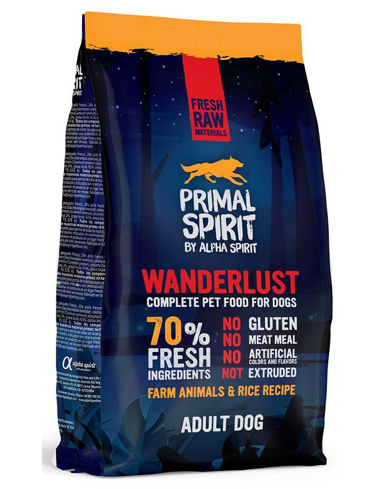 Primal Spirit Wanderlust je bezlepkové, poloměkké krmivo pro dospělé psy s rýží a kuřecím masem.