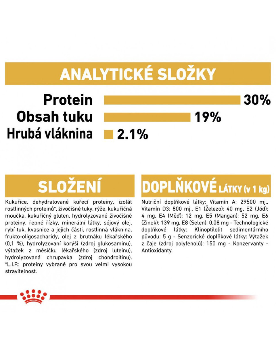 Složení: Kukuřice, dehydratované drůbeží maso, izolát rostlinného proteinu (L.I.P. – protein vybraný díky své vysoké stravitelnosti ),živočišné tuky, rýže, kukuřičná mouka, kukuřičný lepek, hydrolyzované živočišné proteiny, řepné řízky, sójový olej, minerály, rybí olej, kvasnice, rostlinná vláknina, fruktooligosacharidy, olej z brutnáku lékařského (0,1 %), výtažky ze zeleného čaje a hroznového vína (zdroj polyfenolu), hydrolyzovaní korýši (zdroj glukosaminu), výtažek z měsíčku lékařského (zdroj luteinu), hydrolyzované chrupavky (zdroj chondroitinu).