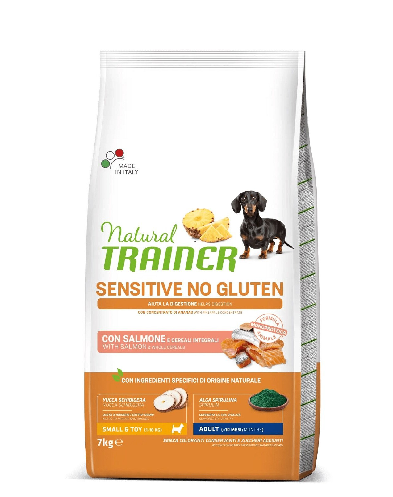 Tento živočišný protein z jednoho zdroje pocházející z lososa zaručuje vynikající kvalitu a chuť. Krmivo TRAINER Natural Sensitive No Gluten Small Toy Adult s lososem navíc neobsahuje lepek, takže je vhodné i pro psy s nesnášenlivostí lepku. Toto jedinečné krmivo navíc podporuje vitalitu vašeho mazlíčka díky spirulině, bílkovinám, minerálům a vitamínům.
