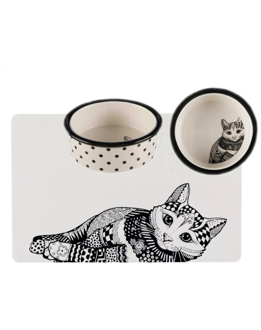 Keramická miska pro kočky Zentangle. Kapacita 300 ml, průměr 12 cm x 2 a podložka pod misky