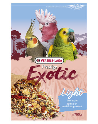 Prestige Exotic Light kombinuje křupavé obilné vločky s ovocem a zeleninou a vytváří tak pamlsek, který si ptáci skutečně užívají – bez zbytečného přidávání tuku do jejich těla.