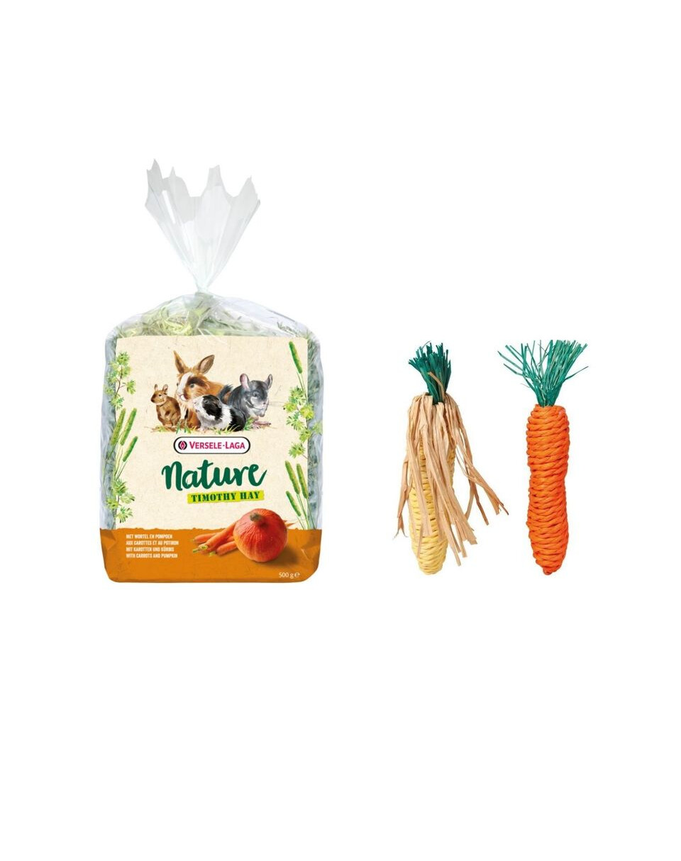 Luční seno Timothy s přídavkem mrkve a dýně. Mrkev a dýně jsou dobrým zdrojem vitaminu A a antioxidantů, které posilují imunitu a kondici organismu. Seno má vysoký obsah vlákniny a podporuje trávení.