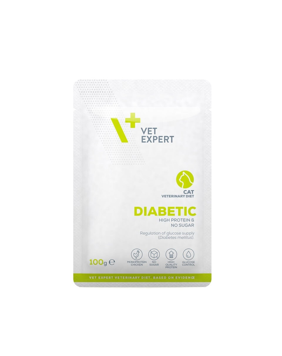 VET EXPERT Veterinary Diet Cat Diabetic je určen pro dospělé kočky s cukrovkou (diabetes mellitus). Krmivo má nízký obsah jednoduchých cukrů, disacharidů a škrobu, které pomáhají regulovat hladinu cukru v krvi. Vysoce kvalitní živočišné bílkoviny poskytují všechny aminokyseliny, které vaše kočka potřebuje.