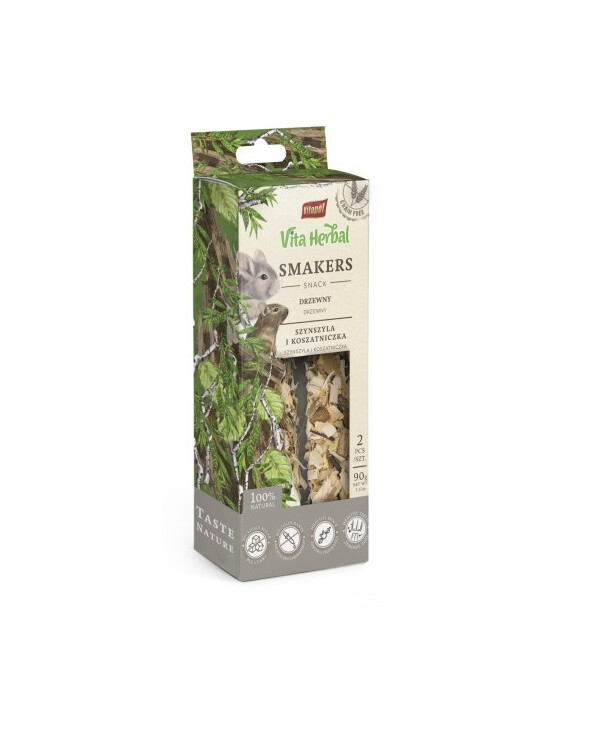 Vita Herbal Smakers je 100% bezobilný pamlsek ideální pro činčily a morčata. Wood Smakers, jak název napovídá, se skládá z kůry a větviček listnatých stromů. Působí jako přirozený žvýkací prostředek pro správné obrušování řezáků a tvrdá struktura pamlsku tento proces dále podporuje. Kromě toho jsou větvičky a kůra vynikajícím zdrojem vlákniny a mají příznivý vliv na trávicí systém zvířat, zmírňují příznaky průjmu a střevních katarů. Smakers neobsahují žádný přidaný cukr ani med.