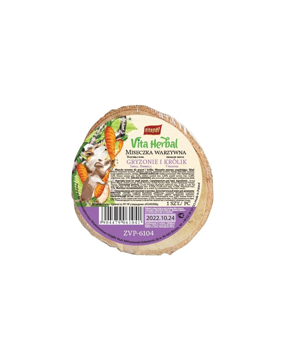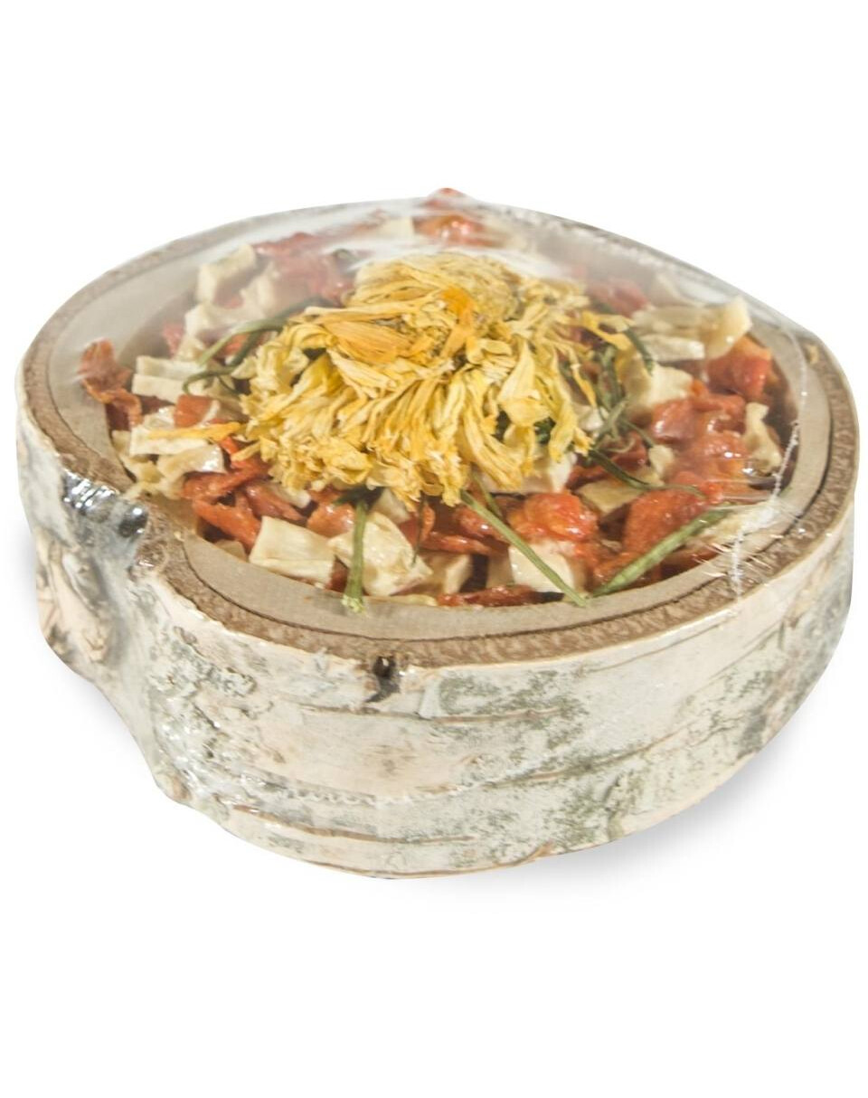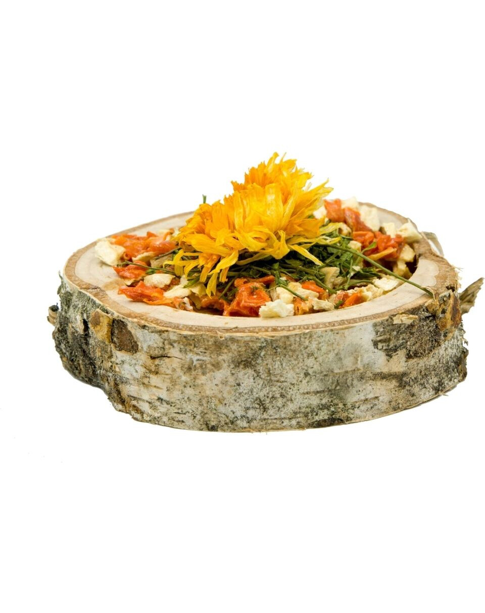 Březová miska na zeleninu pro hlodavce a králíky obsahující doplňkové krmivo pro zpestření denního jídelníčku. Zelenina obsažená ve směsi je zdrojem vitaminů a minerálních látek, které mají příznivý vliv na kondici zvířete.