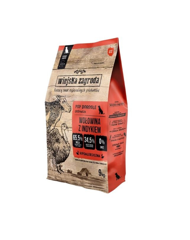 WIEJSKA ZAGRODA Hovězí s krůtím masem je kompletní krmivo pro psy větších plemen.