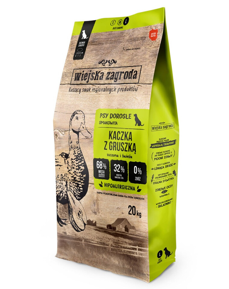 Složení: Kachna (52,5 %, z toho 35 % sušená kachna, 17,5 % čerstvá kachna), kuřecí tuk (11 %), hrách, loupaný hrách, sušené bramborové vločky, hydrolyzovaná kuřecí játra (4 %), sušené pivovarské kvasnice (1 %), lněné semínko, sušené řepné řízky (z cukrové řepy), lignocelulóza (ze smrku), bramborová bílkovina, minerální látky, sušená hruška (0,5 %), lososový olej (0,5 %), sušená čekanka, MOS (mannan-oligosacharidy), glukosamin, chondroitin-sulfát, rostlinné extrakty (rozmarýn, citrusy, kurkuma, hřebíček, juka mojave).