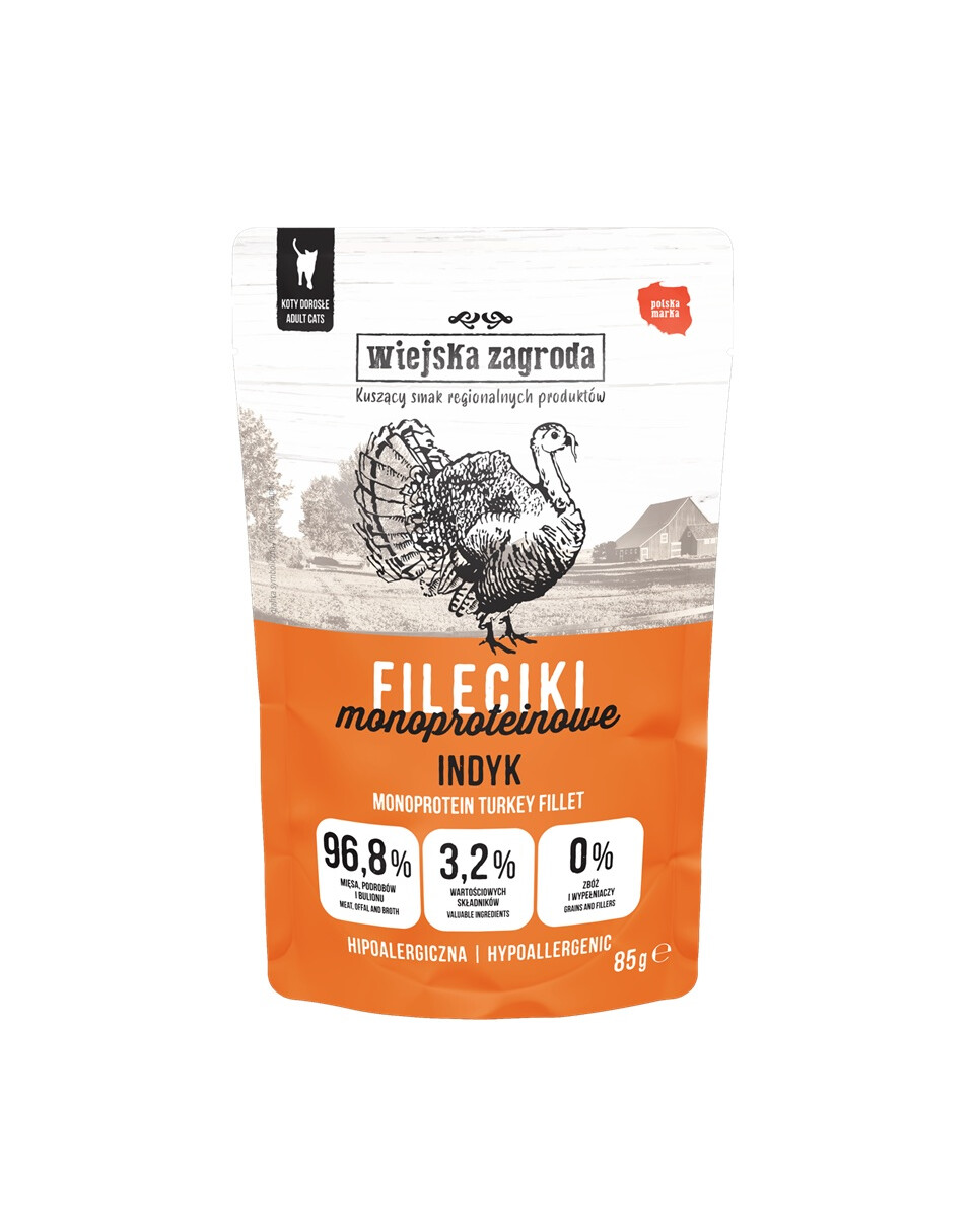 Mokré krmivo pro kočky Wiejska Zagroda Turkey Fillets je perfektní mokré krmivo pro dospělé kočky. Díky vysokému obsahu masa a jemné struktuře filetů je ideální jak pro vybíravé kočky, tak pro kočky s citlivým trávicím systémem. Praktické 85g kapsičky usnadňují krmení vaší kočky. Vyberte si polskou značku proslulou svými vysoce kvalitními surovinami a dopřejte svému mazlíčkovi to nejlepší ze všeho!
