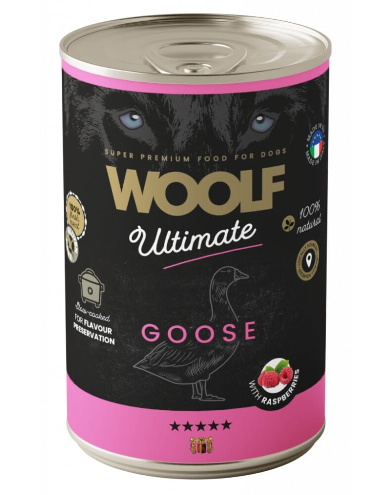 WOOLF Ultimate Adult Dog Goose and Raspberries je kompletní, bezlepkové vlhké krmivo navržené pro dospělé psy všech plemen. Jeho receptura je založena na jemném husím mase – vzácném zdroji bílkovin, který je vhodný pro psy s citlivým trávicím systémem a sklony k alergiím. Přídavek malin dodává krmivu příjemnou sladkost a obohacuje ho o vitamíny, přírodní antioxidanty a složky podporující imunitu a protizánětlivé účinky. Všechny ingredience pocházejí od místních dodavatelů a jsou podrobeny procesu pomalého vaření při nízkých teplotách, což umožňuje zachovat jejich přirozenou výživovou hodnotu a jedinečnou chuť.