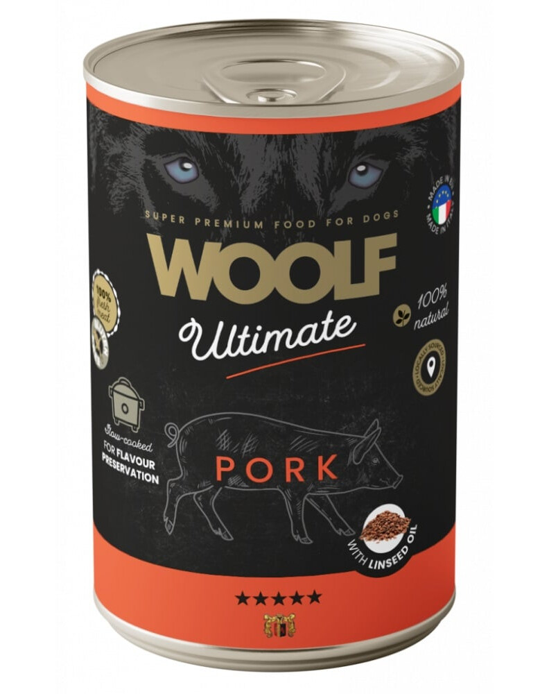 WOOLF Ultimate Adult Dog Pork and Linseed Oil je kompletní, bezlepkové mokré krmivo vytvořené pro dospělé psy všech plemen. Jeho receptura vychází z vepřového masa, které poskytuje bílkoviny s vysokou nutriční hodnotou, a z vnitřností – plic a jater – obohacujících aminokyselinový profil. Přídavek lněného oleje je zdrojem omega-3 mastných kyselin, které podporují zdraví pleti, lesklou srst a správné trávení. Všechny ingredience pocházejí od místních dodavatelů a podléhají procesu pomalého vaření při nízké teplotě, což umožňuje zachovat jejich přirozené nutriční hodnoty a výjimečnou chutnost.