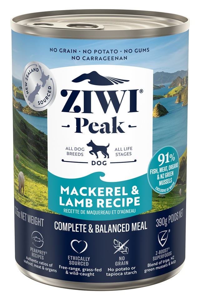 Konzerva pro psy s novozélandskou makrelou a jehněčím masem.