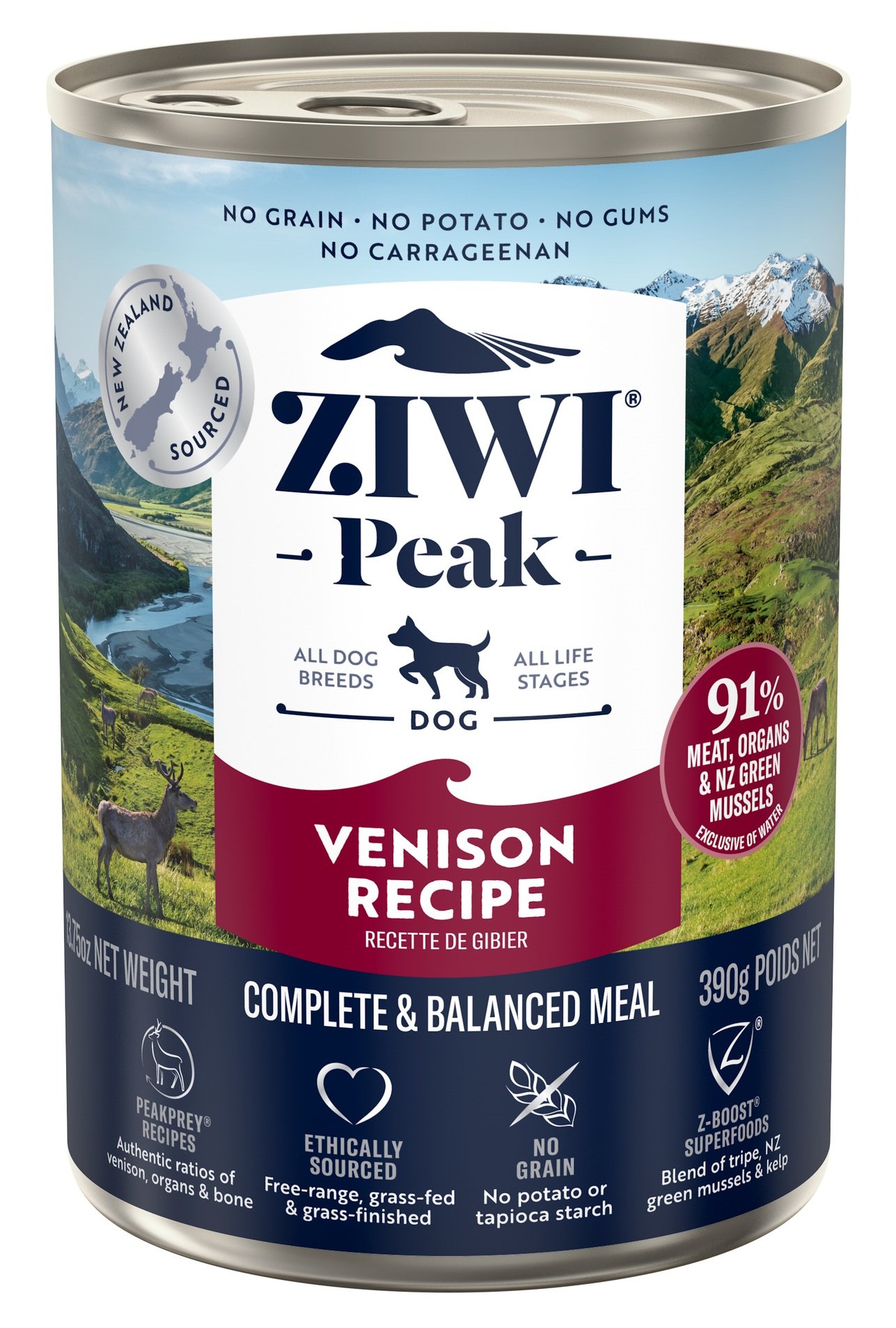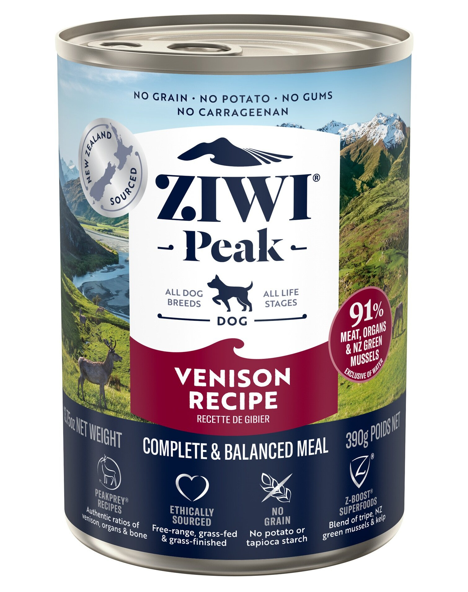 konzervy jsou bohaté na vlhkost obsahující 91 % zvěřiny, orgány, kosti a novozélandské zelené mušle, navržené tak, aby vyhovovalo biologickým potřebám vašeho psa ve stravě bohaté na maso.